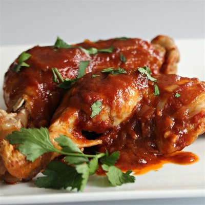 Muslos de pollo se cuecen a presión bañados en una salsa tipo barbeque picante y fácil. Prepara receta en menos de 30 minutos.